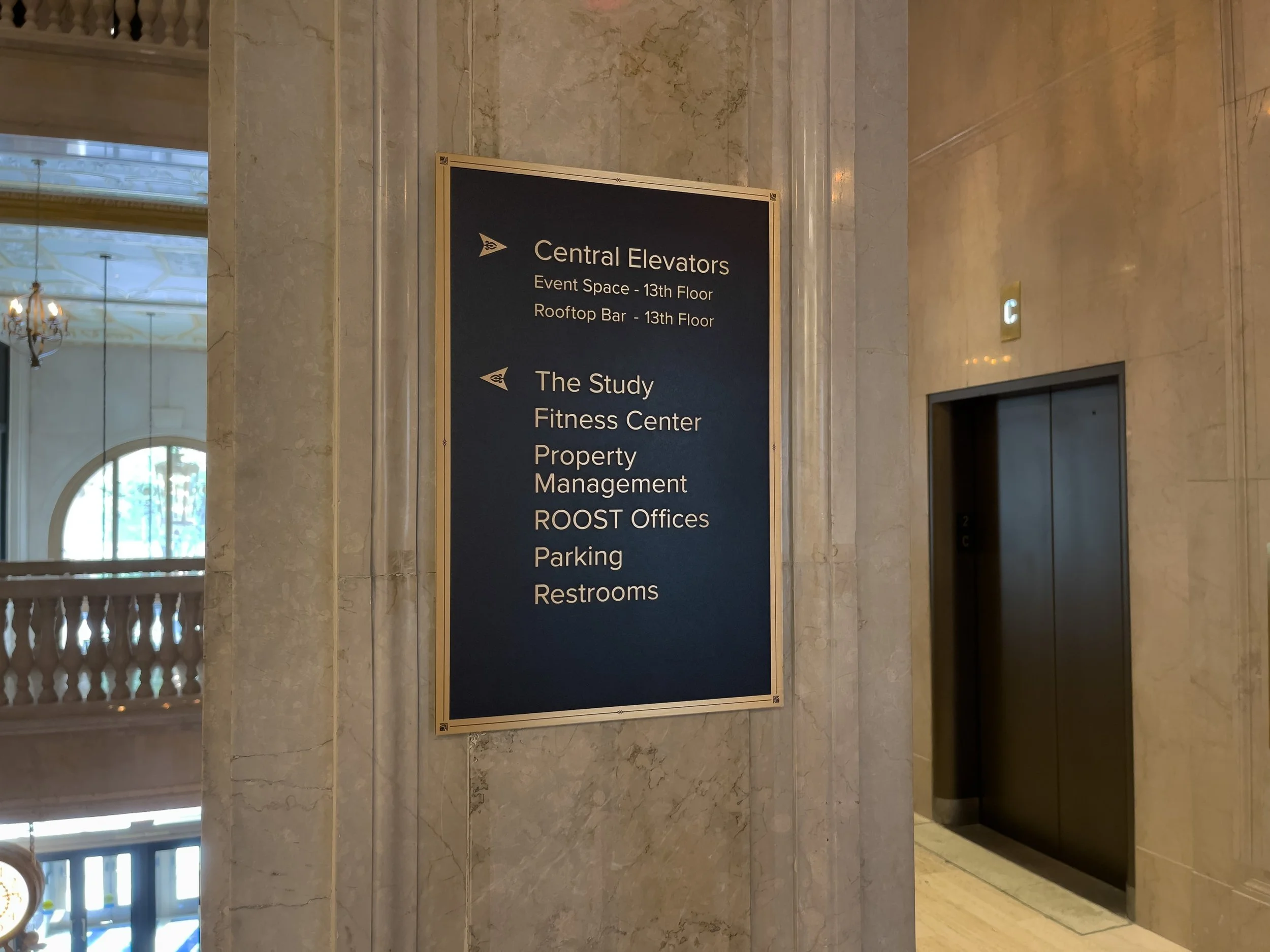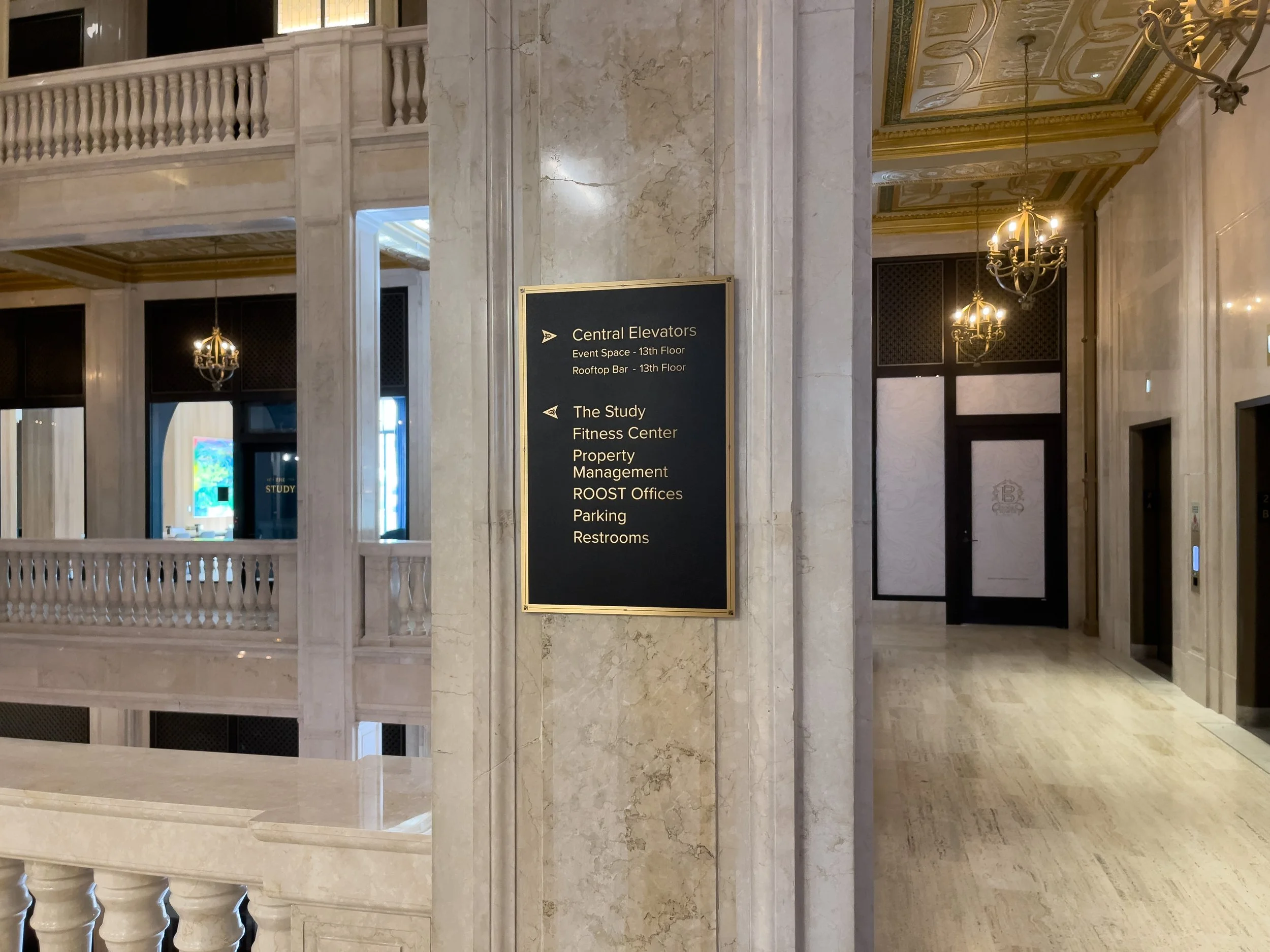 Each signage component was carefully designed to complement ornamental details and original finishes, ensuring the system enhanced rather than competed with the restored interiors.