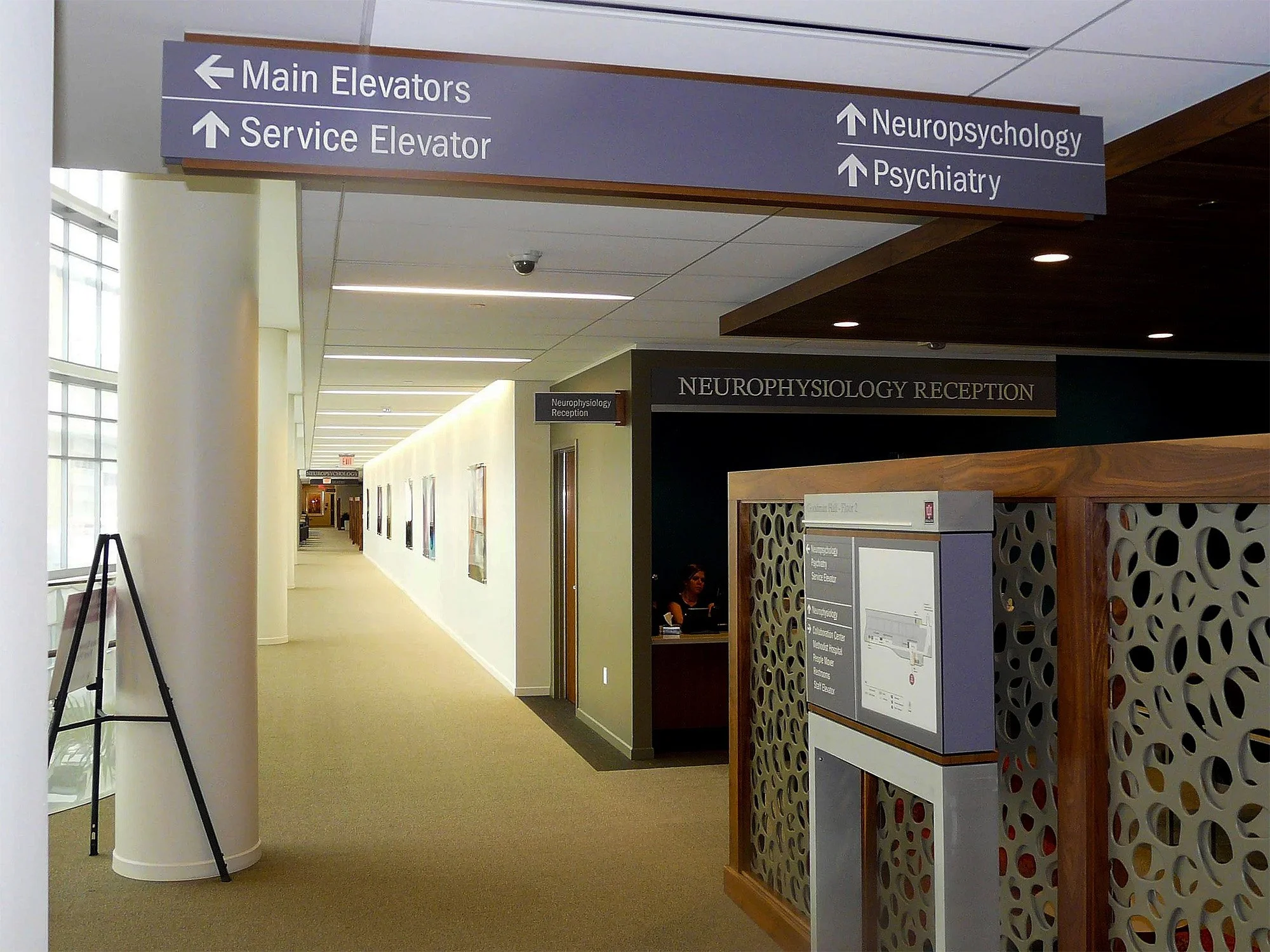 Interior Wayfinding: We develop directional signage for departments and services, floor directories, custom maps, and room identification.